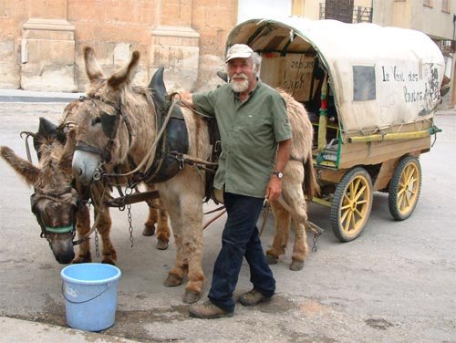 burro se llama Titus, y el perro negro que les acompaña atado a su tartana es