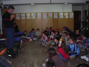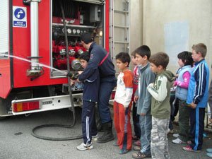 Después de comer fuimos al parque de bomberos de Teruel. Nos contaron qué hacen en su trabajo. A Javier le pusieron el traje de bomberos, ¡qué risa!, y también nos dejaron tirar agua con la manguera, yo no podía sujetarla porque me empujaba. Después nos llevaron en el camión de bomberos y puso las luces y la sirena.