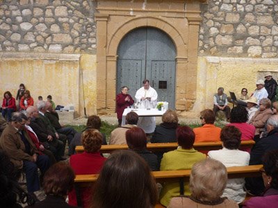 Aun en condiciones adversas, al aire libre, el coro es capaz de sacar sus mejores sonoridades para cantar a la Santa Patrona en su ermita. Desde lo alto, en la colina, sin la resonancia de las cuatro paredes del templo, elevan su himno a Santa Flora para que le llegue a lo alto y bendiga los campos y el Mas de las Matas.