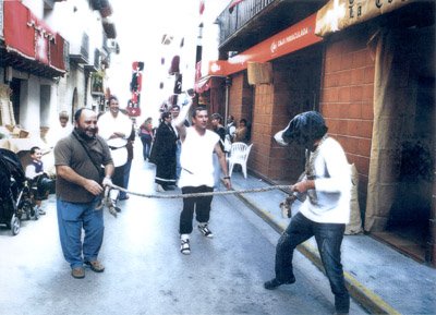 Nuestro amigo Perro Martín hizo una charlotada disfrazado de hombre perro por esas calles en plena fiesta del comendador, y Valentín lo llevaba del ramal. No sabemos si es un genio del surrealismo o si está como una cabrica. Pasaros por